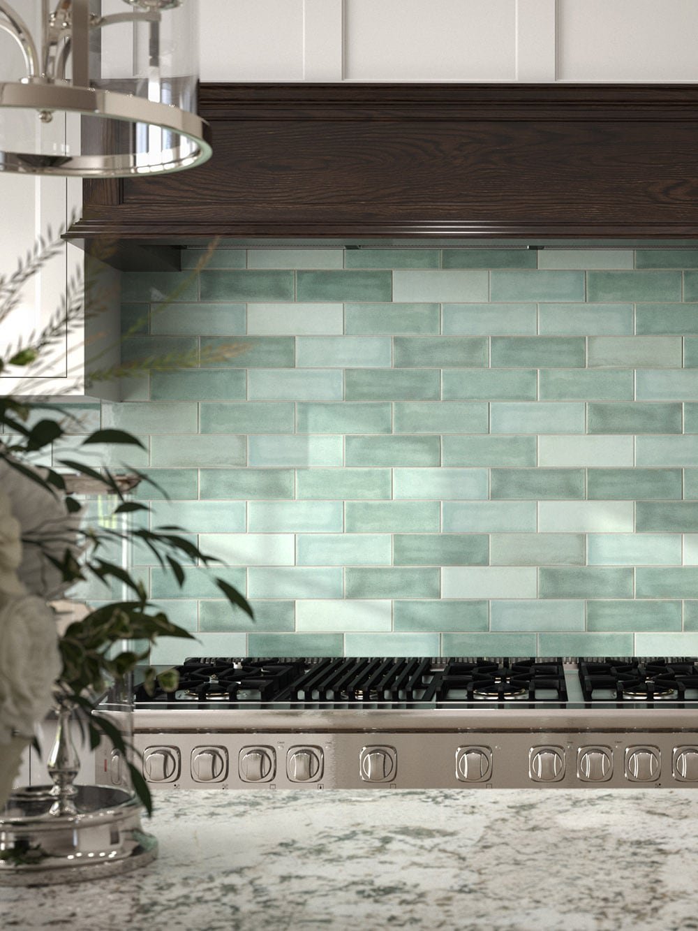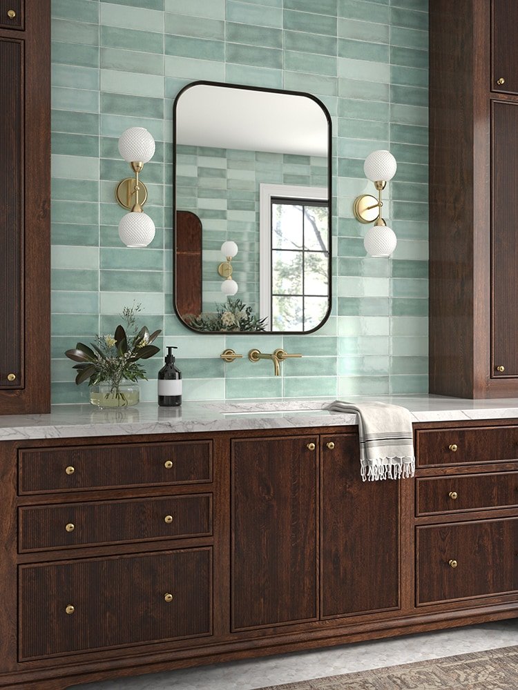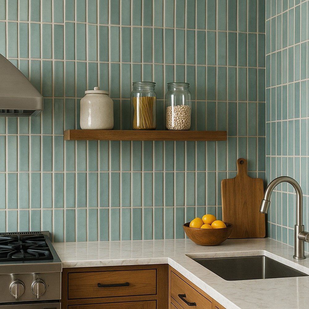Shades of blue/green subway tiles are decorative and durable, making it a great back drop – plus the variation in this tile will give it a fresh, handmade look.