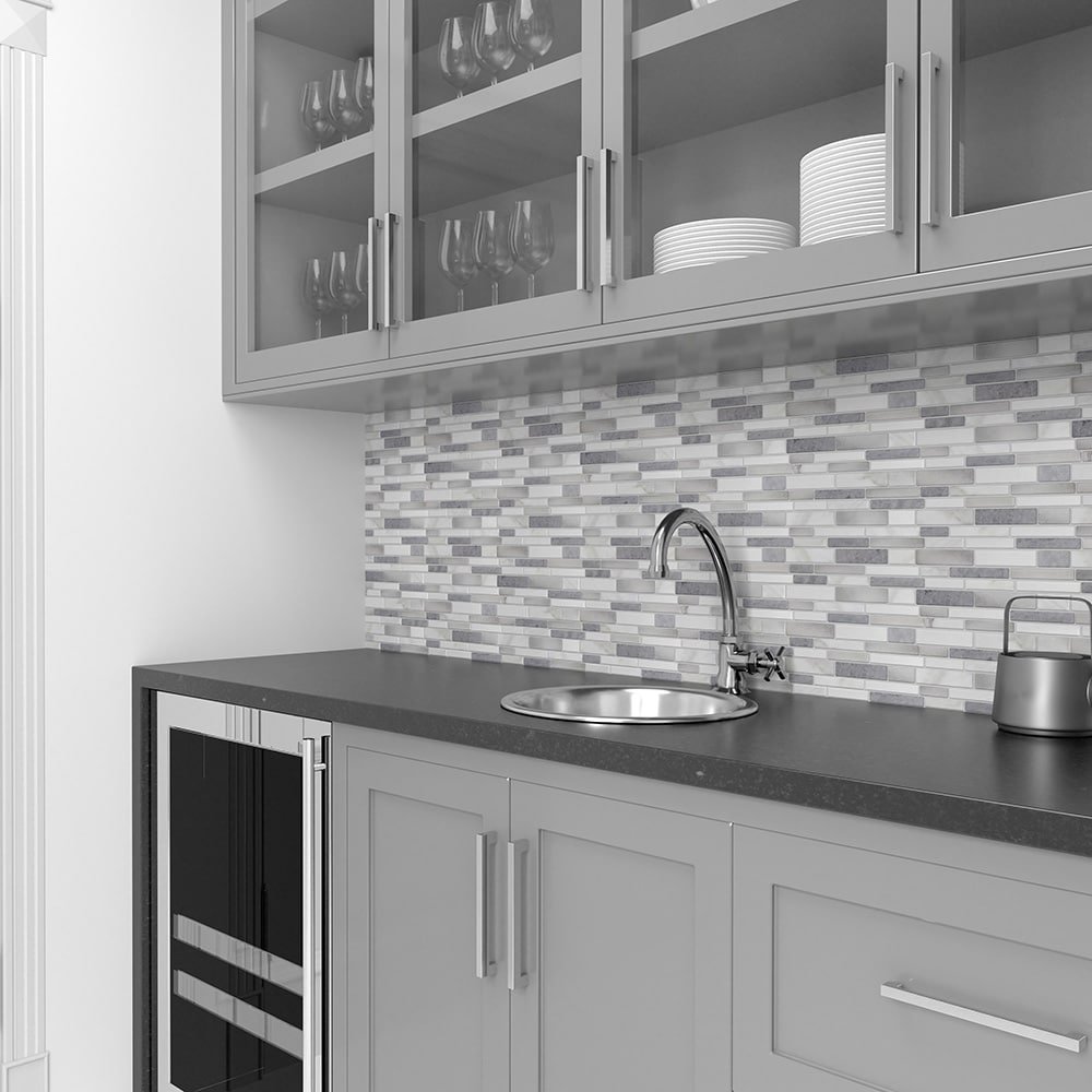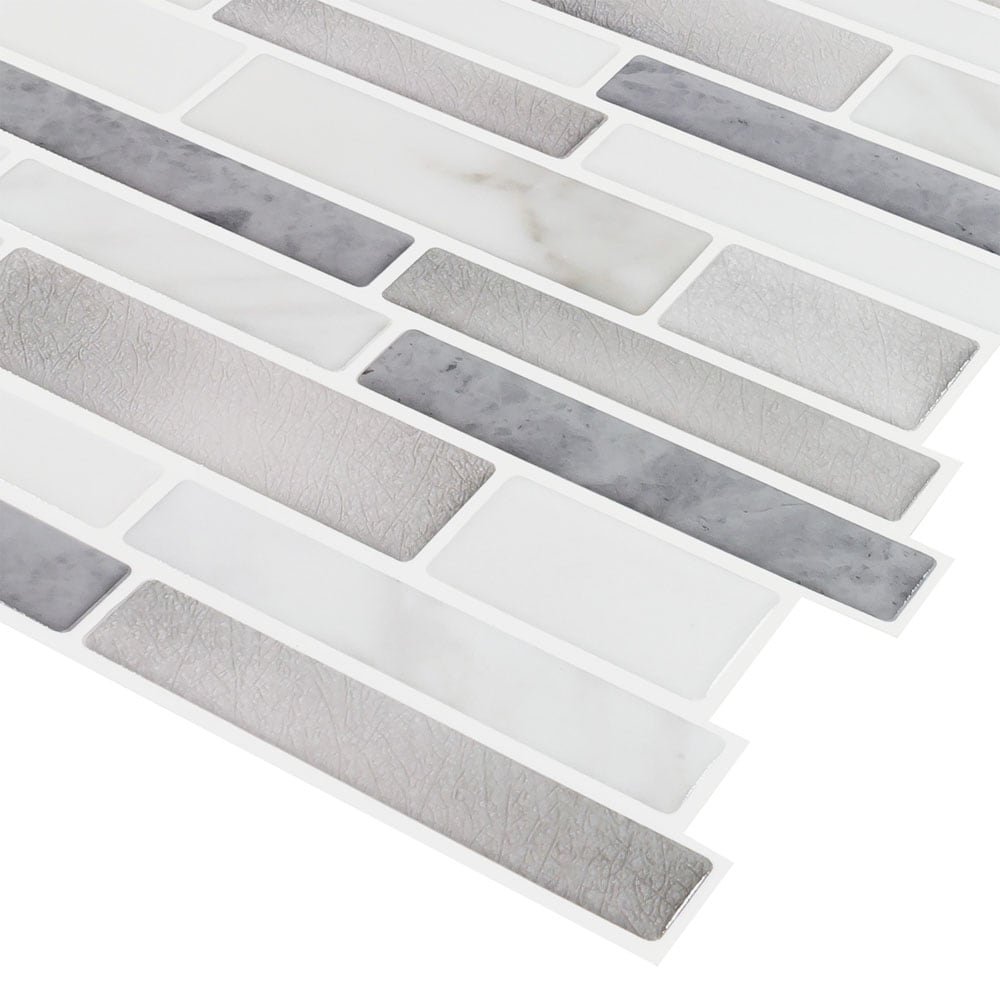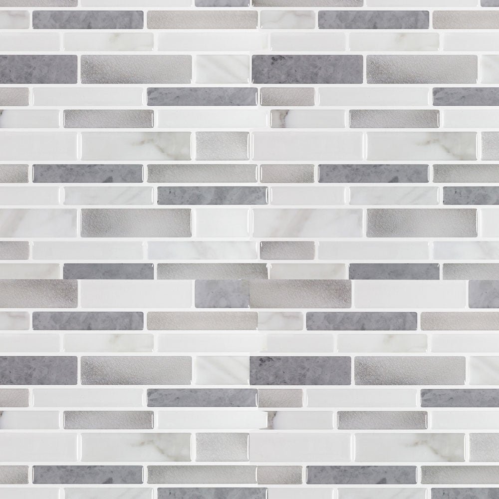 Transform any room into a trendy chic space with this faux stone and metallic look, linear with a classic style. The soft white and gray color pallet add a simplistic designer look to your space.