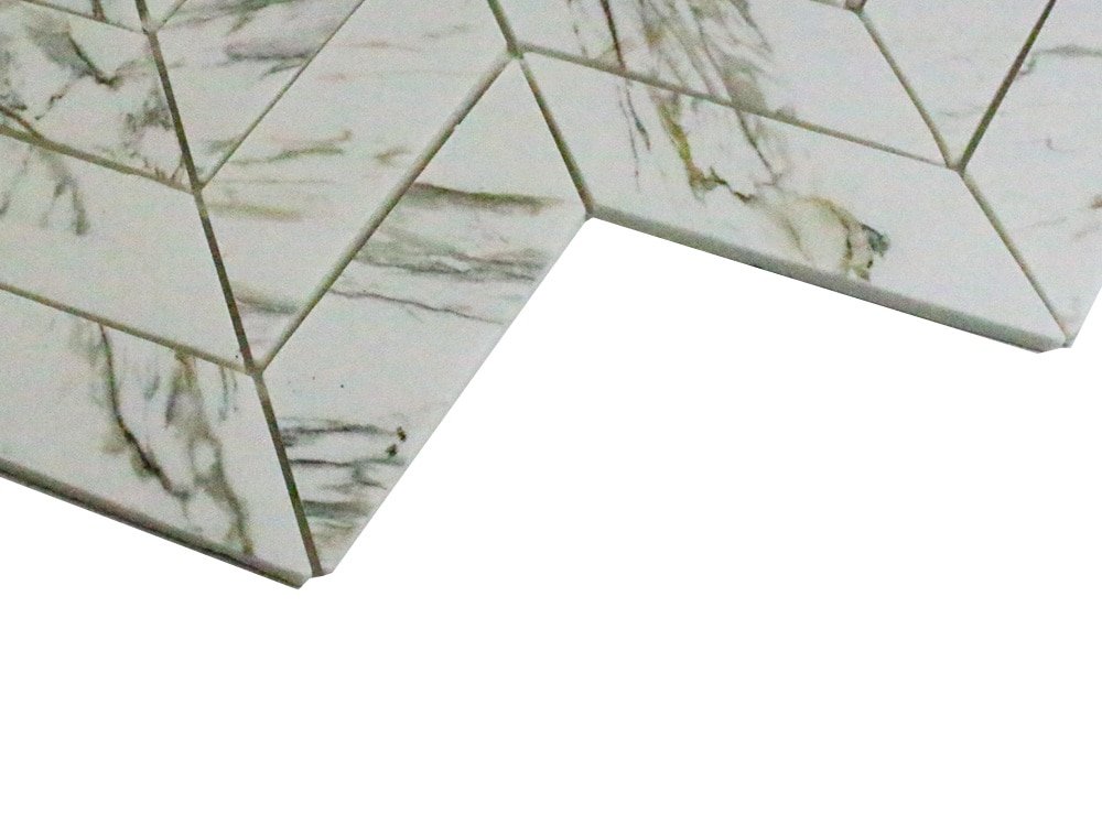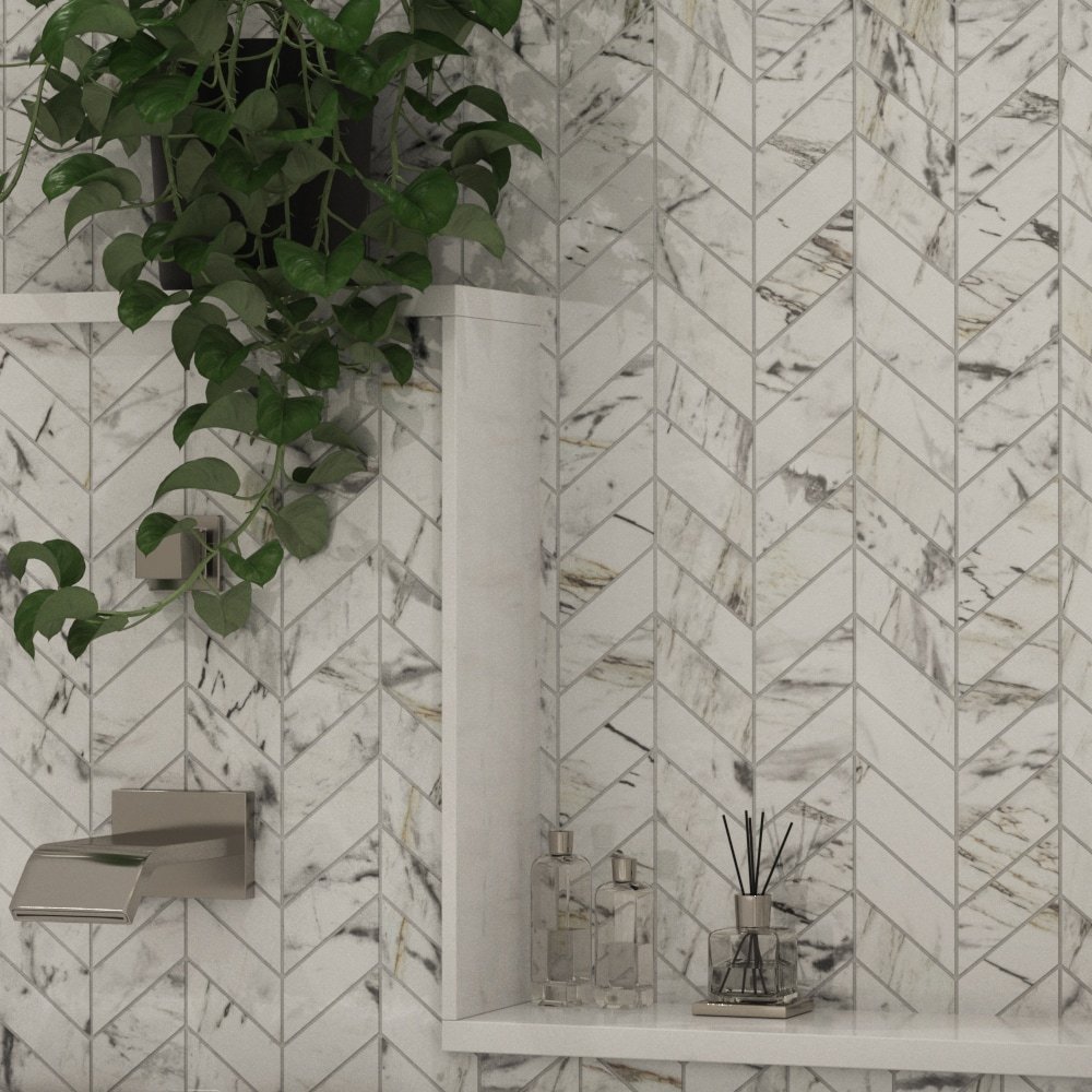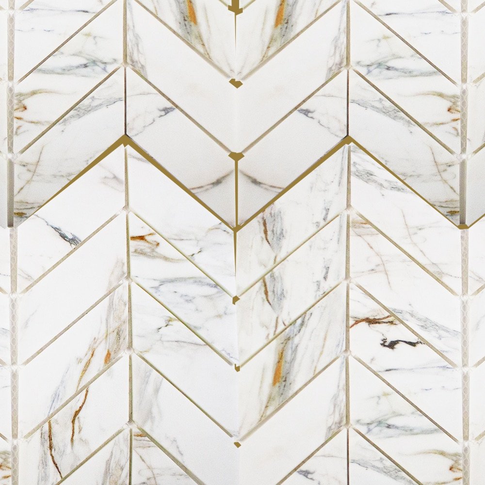 Let the stunning Regal Ridge Chevron mosaic enhance your home with its stone-like appearance and royal charm.